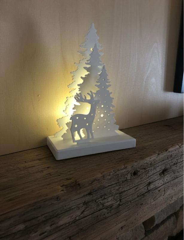 reindeer and a layered pine tree silhouette. The soft LED illumination creates